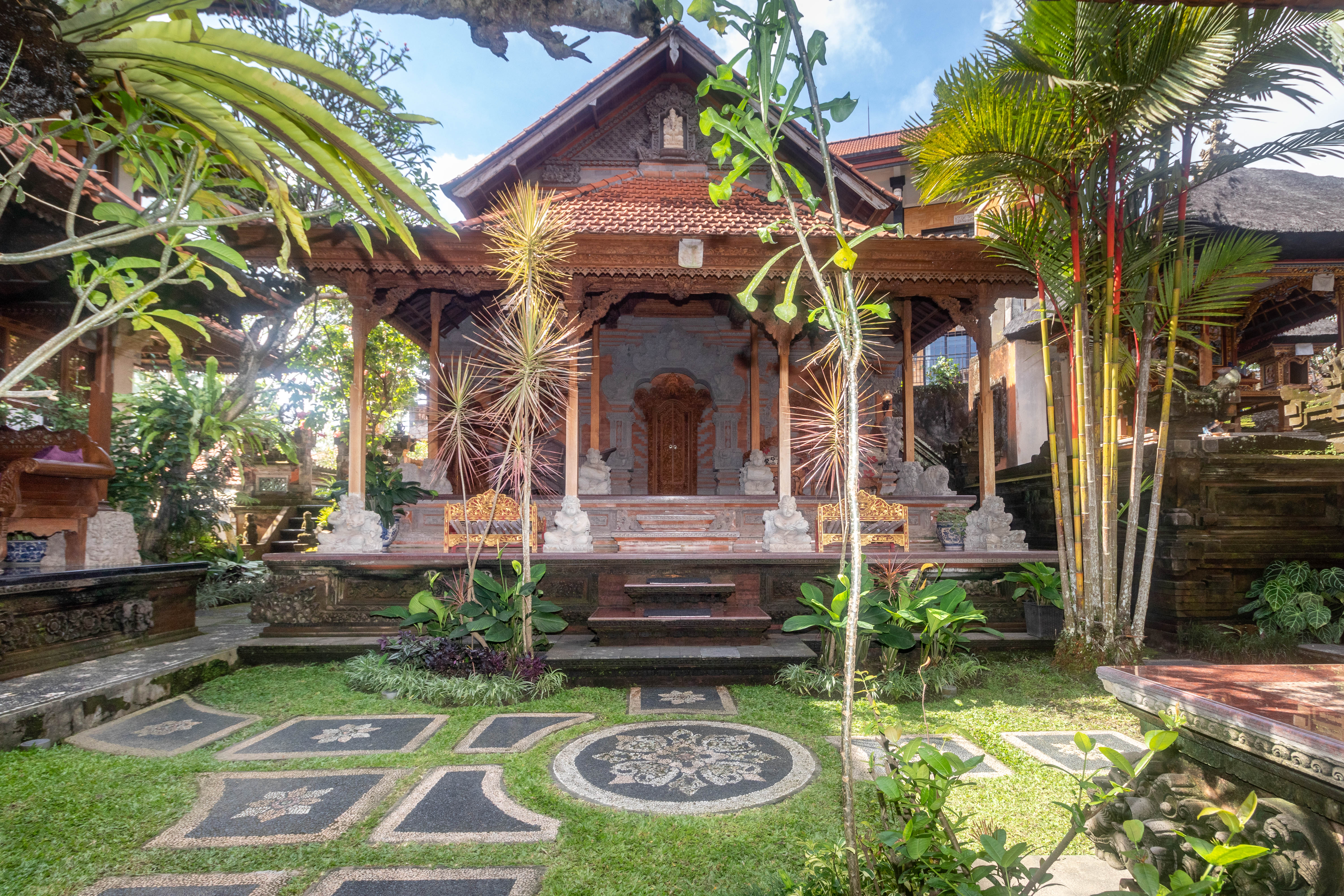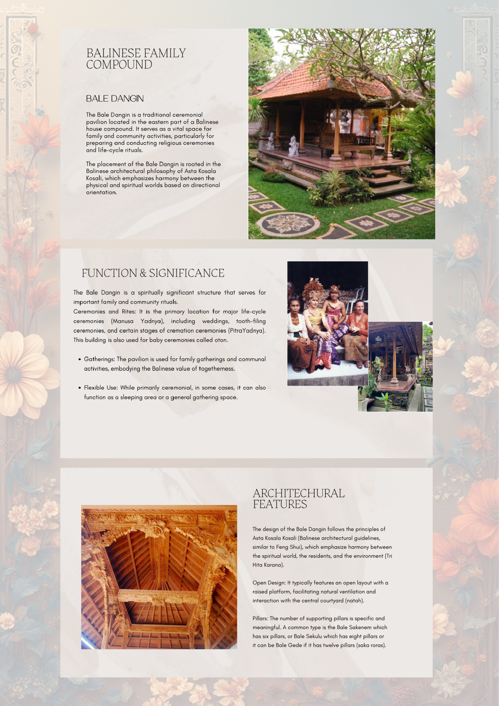 A Balinese family compound is a walled, multi-generational living space organized by spiritual principles, featuring distinct pavilions for sleeping (Bale Meten), ceremonies (Bale Dangin), communal use (Bale Dauh), kitchen (Paon), and a crucial family temple (Sanggah) in the northeast, fostering unity, tradition, and harmony with nature through shared living and daily offerings.